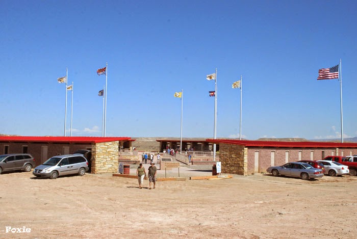 Ještě před vjezdem k monumentu jsme se fotili u cedulí vítajících nás v Novém Mexiku, pak jsme zaparkovali vedle nízkých podlouhlých budov, které dohromady tvořily jakýsi kosočtverec. Uvnitř toho prostoru vlály vlajky, a když jsme přišli blíž, zjistil jsem, že ty budovy jsou vlastně jakési kóje, kde mají indiáni svoje stánky. Celá oblast patří Navahům.
