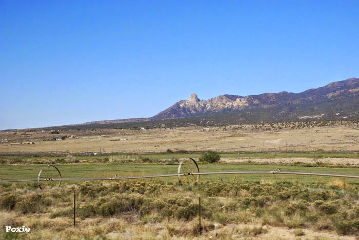I přesto, že nás čekal poslední dlouhý přejezd delší než 300 mil (přes 480 km) jsme vstávali docela pozdě a z motelu vyráželi až před devátou hodinou. Měli jsme namířeno k Four Corners Monument, kde jsme měli opustit Colorado. Míjeli jsme zelené pastviny, hory a bílé ploty, za kterými se pásli koně, ale ráz krajiny se pomalu měnil v písčité suché kopce a skály s vyprahlou travou. Cedule lákající na barevné Colorado tu neměla valného významu, protože tohle barevné vůbec nebylo. Bylo zjevné, že se blížíme k hranicím Arizony a Nového Mexika.