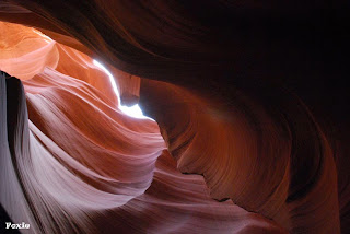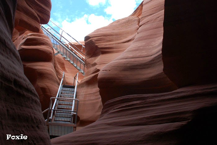 Nižší Antilopí kaňon je dole, jak vám asi z mého předešlého vyprávění došlo. Terén je o poznání náročnější a návštěvníci do něj vstupují po kovových žebříkách upevněných ve skalách. Právě žebříky usnadňují pohyb i přímo v kaňonu. Jinak by nebylo vůbec možné se přes některé úseky dostat, cesta je navíc občas těsná i pro jednoho. Odměnou za tento výkon hodný kamzíka je nádherný pohled na dokonale zaoblené skalní stěny z červeného pískovce. Ptáte se, jak tahle krása mohla vzniknout?