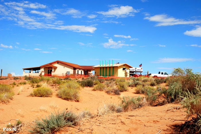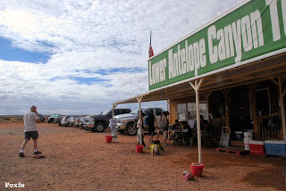 Předchozí den jsme ukazatele na kaňon míjeli, ale já pořád nepřestával hledat nějaké vysoké skály, jenže kde nic, tu nic. Všude jen holá plocha, nic nenasvědčovalo nějakému kaňonu. Změna času u hotelu byla asi jen chvilková, neboť si nepamatuju, že bychom se někde stavěli a cesta nám určitě netrvala hodinu, jak se mi snaží tvrdit metadata fotek. Dojeli jsme po téměř rovné silnici na parkoviště u dřevěné chajdy s terasou po deváté hodině ráno místního času. Zelenobílý nápis na průčelí hlásal Lower Antelope Canyon Tours.