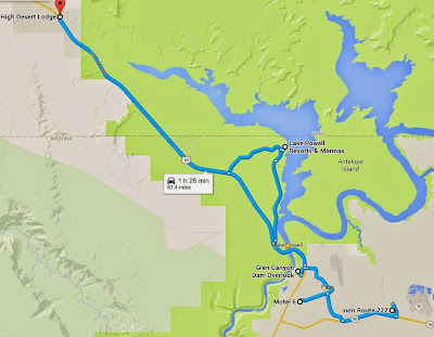 Dojeli jsme až na parkoviště u jednoho z přístavišť, nafotili si lodě a vodní plochu, ta v nejširším bodě dosahuje od břehu na břeh 40 kilometrů a průměrná hloubka se pohybuje kolem 40 metrů (max. hloubka je 178 metrů). Pak jsme se vrátili na hlavní silnici a pokračovali k Big Water v Utahu, kde jsme měli sjednané dva noclehy. Šlo o motel High Desert Lodge v kovbojském stylu s venkovní restaurací. Měli jsme opravdu moc pěkný pokoj plný amerických vlajek. Za budovou motelu se nachází venkovní jízdárna, kde se nejspíš pořádají i nějaké westernové soutěže.