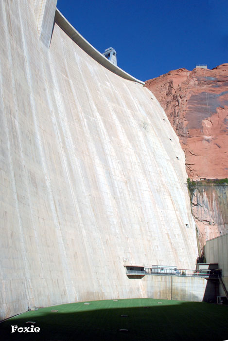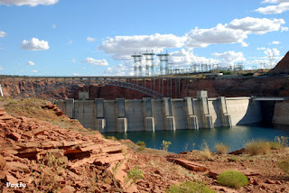Někdy kolem jedné jsme ale vyrazili zpět k Page. Jako náš cíl jsme zvolili oběd a posléze přehradu, kolem které jsme neustále jezdili sem a tam. S jídlem jsme vzali za vděk McDonaldem v Page a pak se přesunuli na Glen Canyon Dam. V suvenýrech se mi povedlo získat několik pohledů a koukal jsem tam na indiánskou flétnu. Nakonec se mně cena kolem 200 dolarů zdála přece jen moc vysoká, takže jsem si nechal zajít chuť a raději jsme si prošli Visitor Center. Prohlídku přehrady jsme propásli o několik minut, a tak jsme na další museli čekat hodinu. Sedli jsme si tam na lavičky a pozorovali nedaleký most, po kterém my sami přejeli za těch pár dní hned několikrát – Glen Canyon Bridge. V současnosti je se svoji výškou 210 metrů nad řekou Colorado 37. nejvyšším mostem na světě (v době dokončení byl dokonce 1.). Jeho délka činí 387 metrů a v době dokončení (1959) šlo o 4. nejdelší obloukový most na světě.