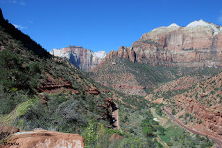 Přijížděli jsme k bráně a rovnou jsme museli zastavit u cedule označující vjezd do parku. Kousek před touto branou mění silnice svoji barvu na červenou, aby zapadala do rázu okolních rudých skal. Červená silnice a bílé, růžové a rudé skály, tak by se dal popsat Zion National Park z auta. Dorazili jsme k tunelu, který je v podstatě tím pravým vstupem, bez ohledu na to, že cedule i vstupné se vybírá kus před ním. Po projetí tohoto nevysokého tunelu jsme se dostali k úchvatné vyhlídce do údolí, kudy vedla červená silnice a nad ní se tyčily zalesněné hory hrající barvami od červené až po bílou.