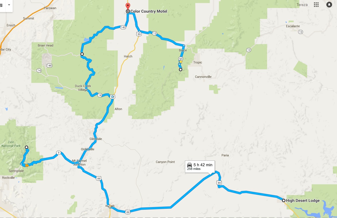 Silnice nás zavedla až do onoho malého městečka, které v roce 2014 oslavilo svých 150 let od založení. Najít motel, ve kterém jsme měli sjednané ubytování, nedalo příliš práce, Panguitch leží na ploše asi 3,5 km2 a počet jeho obyvatel podle sčítání nikdy nepřesáhl 2000. Nedaleko leží Panguitch Lake. Bylo asi půl třetí, když jsme se ubytovali a zamířili do očekávaného národního parku.