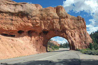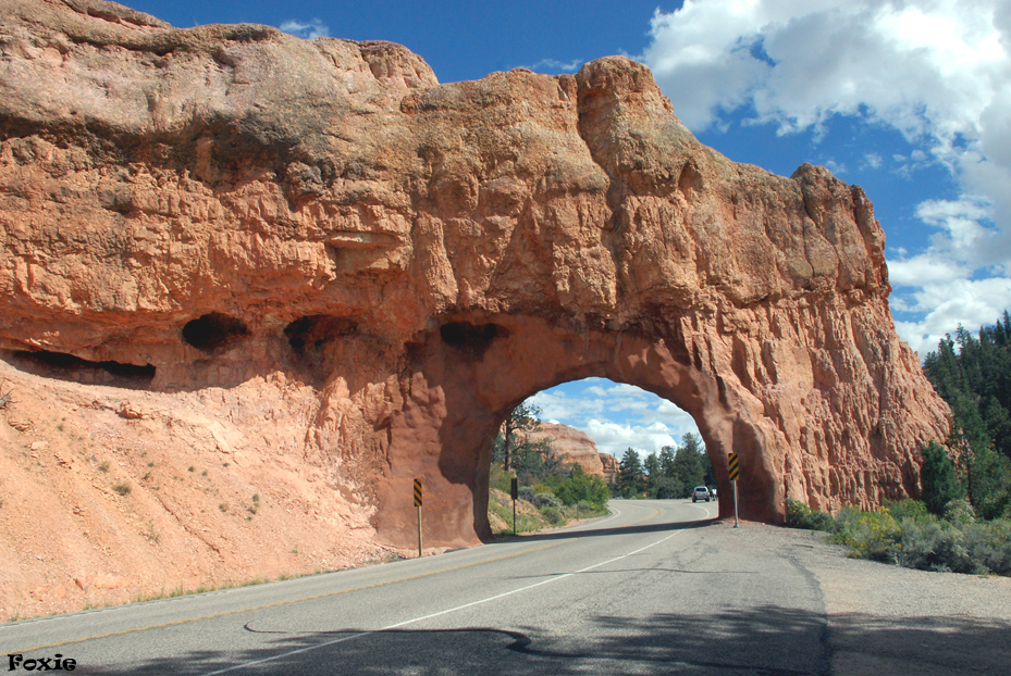 Skály kolem nás postupně rudly do stále intenzivnějších barev, načež jsme se dostali do Dixie National Forest, který víceméně ukázal to, co jsme později viděli v kaňonu ve větším. Projeli jsme přes jakési skalní okno, která jsou pro Utah typické. Přesto tohle příliš typické nebylo, spíš šlo o dveře než o okno… nebo extrémně krátký tunel, jak ctěný čtenář chce.