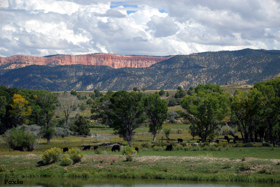 Zhruba po další půl hodině nás cedule uvítala v Garfield County, naše ubytování se blížilo. Správním městem tohoto okresu je totiž právě Panguitch, kam jsme mířili do Color Country Motelu. Cestou jsme míjeli pastviny, na kterých se pásly koně a krávy, za zeleným údolím se ale tyčila barevná skaliska patřící k Bryce Canyon National Park.